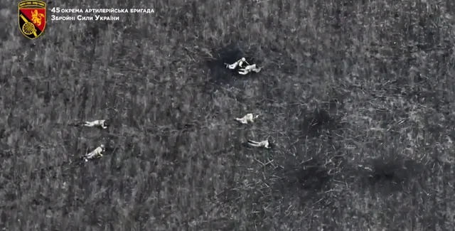 Російських найманців у білому маскувальному одязі добре видно на безсніжному полі. Деякі отримали поранення та намагалися повзти з обстрілюваного артилеристами квадрата.