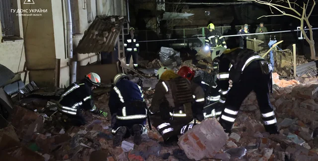 Після обстрілу Харкова сьогодні вночі біля пошкодженого будинку працювали шість пожежних автоцистерн, дві автодрабини, машина "швидкої", а також спецтехніка рятувальників.