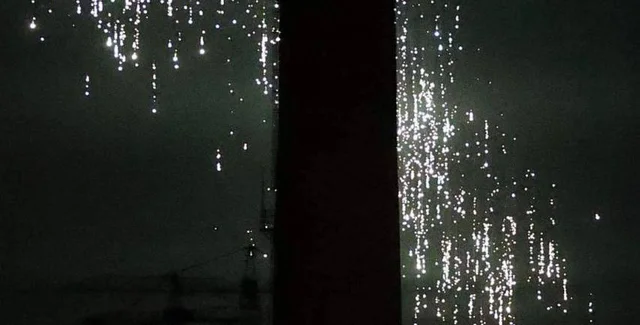 На відео, яке розмістили в місцевих пабліках, видно, як сліпучі білі крапки падають просто на дахи багатоповерхових житлових будинків.