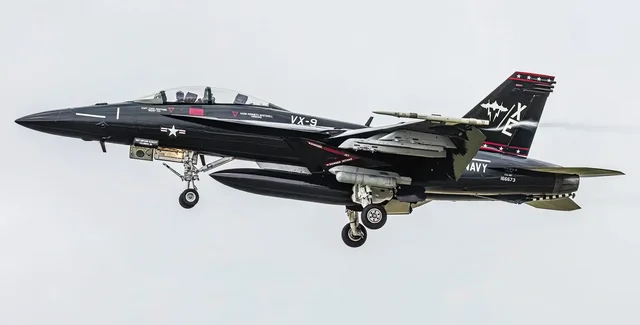 Літак 9 авіаційної випробувальної ескадрильї Vampires базується на аеродромі військово-повітряних озброєнь у Чайна-Лейк, Каліфорнія. F/A-18 Super Hornet сфотографували під час заходу на посадку на базі ВМС Вентура Каунті Пойнт Мугу.