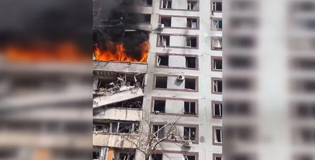 Президент показав відео наслідки влучення снаряда в будинок. Ракета поцілила приблизно в середину багатоповерхівки, на кадрах видно сильну пожежу та вибите скло квартир. Постраждали й будинки поблизу — у них розбиті вікна та балкони. Після обстрілу видно хмари густого диму.