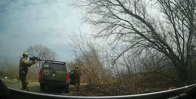 При цьому запис ведеться з відеореєстратора, тому не видно, як відбувається фейкова розмова. Після перевірки документів один із "військових" вистрілив з автоматичної зброї кілька разів, проте на відео не зрозуміло, чи стріляв він у повітря, чи у бік машини.