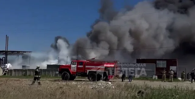 Рятувальники уточнили, що спалахнули бочки з мазутом на заводі "Євробетон" у Ставропольському краї. Російське медіа Shot пише, що пожежа сталася на майданчику з переробки автомобільних покришок.