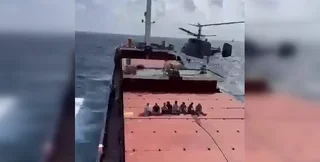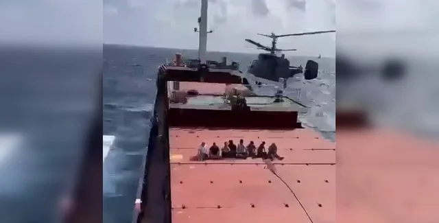 Російські мілітарі-пабліки показали, як вертоліт наблизився до палуби і в його кабіну швидко стрибнули озброєні люди. Ймовірно, це були солдати ЗС РФ, які оглянули судно.