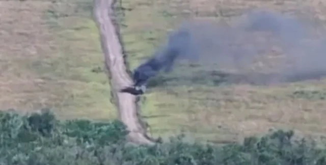 На відео можна побачити, що російська ворожа бронетехніка рухається по дорозі серед поля. Згодом українські бійці застосували ударний дрон. Бойова російська машина була ліквідована.