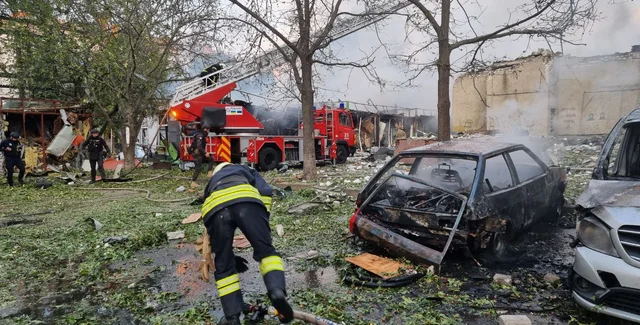 В результаті атаки виникла пожежа, а також загорання торгівельних павільйонів на ринку.