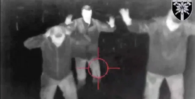 На відеозаписі, що знятий уночі, видно, як чоловіки виходять з лісосмуги з піднятими вгору руками, в яких була зброя. На кадрах можна нарахувати близько п'яти окупантів.