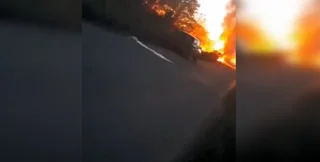 На відео з місця подій видно, як вночі на узбіччі дороги палають автівки. На іншому відео — ті ж машини, але вдень після пожежі. Є кадри з уламками вантажівок та залишками номерів.