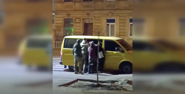 На відео видно, як люди у військовій формі насильно заштовхують когось в бус. Інші люди у цивільному сваряться з ними, намагаються їм завадити та знімають подію на телефони.