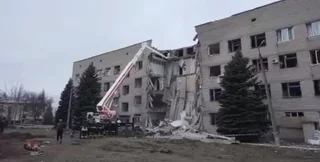 Фахівці та відповідна інженерна техніка працюють на місці влучання ворожої ракети в міську лікарню.