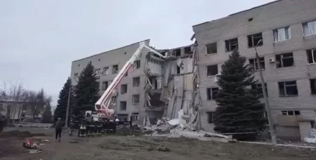 Тривають пошуково-рятувальні роботи. Фахівці та відповідна інженерна техніка працюють на місці влучання ворожої ракети в міську лікарню.