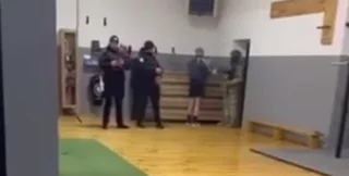 На відео можна побачити як люди у формі, а дехто й цз автоматами, перевіряють документи в чоловіків, які прийшли позайматися в спортзалі. Утім, на записі не чути, про що говорять люди.