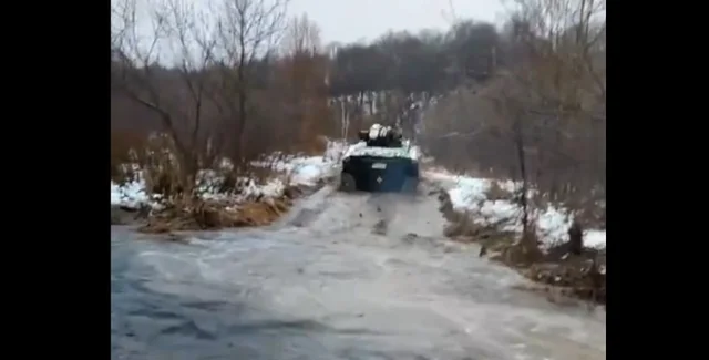 На кадрах бронетехніка долає водну перешкоду, просуваючись далі розмитою дорогою.