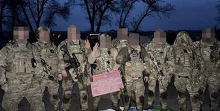 На опублікованому фото бійці стоять із табличкою адміністрації та на російському прапорі. Де саме зроблено знімок, невідомо, оскільки нічого, окрім людей і дерев на задньому фоні, не розгледіти.