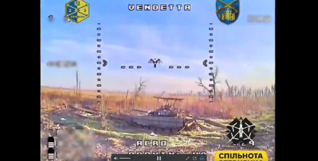 На відео видно, як український дрон, який побачив припаркований російський танк з різними антидроновими засобами на даху, мчить його знищувати.