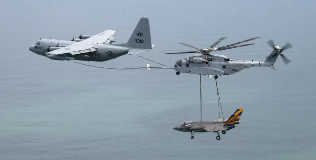 Гелікоптер Корпусу морської піхоти США CH-53K King Stallion є найпотужнішим бортом у складі армії. Військові показали унікальне явище: вертоліт ніс винищувач F-35C поки його у повітрі дозаправляв літак-заправник KC-130T Hercules. Про це повідомляє The War Zone.