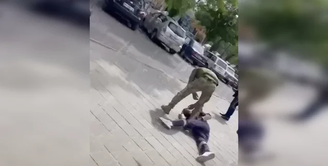 Насправді ж очевидці інциденту зафільмували бійку. Чоловік, вдягнений у військову форму, до військкомату стосунку не має. Насправді він є військовослужбовцем, який повернувся з передової.