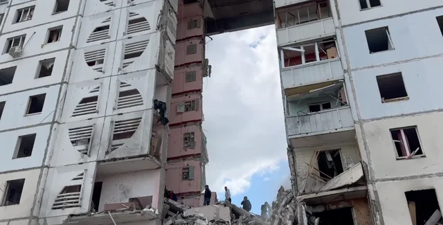 Унаслідок удару чи підриву впало 10 поверхів одного підʼїзду. Офіційна влада звинувачує в ударі Україну, але в соцмережах не заперечують, що відбувся вибух всередині.