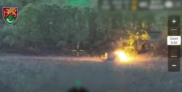 Українські бійці за допомогою ударного дрона знищили славнозвісний російський танк-"черепаху". Техніка згоріла разом з екіпажем.