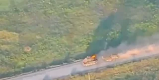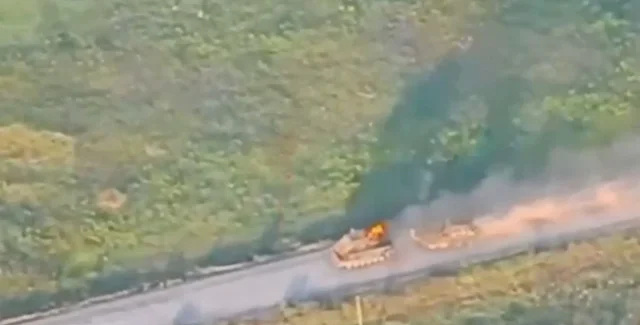 Бійці ЗСУ провели операцію зі знищення двох одиниць бронетехніки ЗС РФ з використанням двох дронів. Перший дрон вистежив російські машини, другий — підірвав, показано на відео з місця подій.