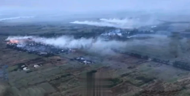 На відео, прикріпленому до повідомлення, можна побачити панораму села, зафіксовану з дрона. Видно зруйновані будинки, кілька точок, з яких здіймається дим після вибухів. У кадр потрапила бронемашина — БТР чи БМП: вона стріляє зліва направо. Помітно, як повітря прорізається червоними слідами пострілів.