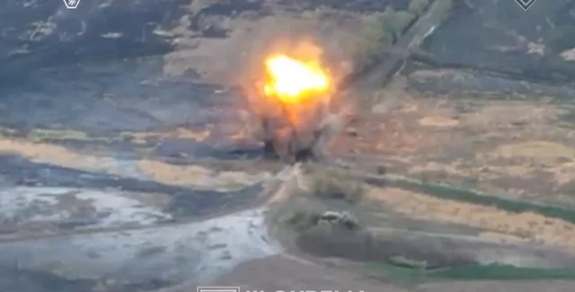 На відео видно, як дрон, яким керує український військовослужбовець, чітко потрапляє у ціль, після чого над складом стається потужний вибух, а у небо здіймається гриб з диму.