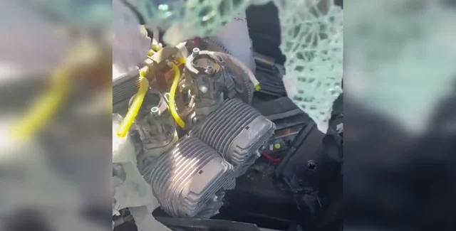 На відео видно, як мотор пробив лобове скло, та опинився на передньому сидінні автомобіля. Чоловік разом із другом оцінюють завдану шкоду. В якийсь момент чоловік просить власника авто не чіпати деталь від дрона, побоюючись, що вона може здетонувати.