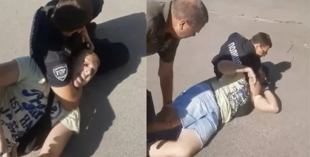 На відео видно, що навколо нього є двоє чоловіків у поліційній формі та один чоловік у камуфляжі. Усі вони тримають чоловіка, який лежить на асфальті.