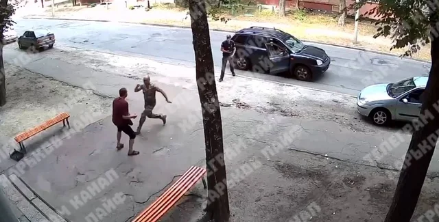 У цей момент чоловік у синій футболці підскочив і почав тікати в під'їзд, але його почав наздоганяти чоловік у військовій формі і вдарив другого цивільного по шиї. Із чим пов'язаний цей інцидент — невідомо, а в Telegram-каналі стверджують, що у дворі сиділи батько із сином.
