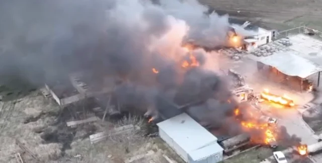 За даними Петра Андрющенка, FPV-дрон уразив АЗС біля міста, коли окупанти заправляли свою техніку. Пожежа призвела до детонації резервуарів із бензином і дизпаливом.