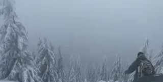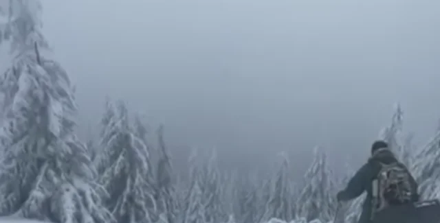 На іншому відео чоловік з рюкзаком та на лижах спускається з гори, інша особа його знімає. Судячи з напису, люди знаходяться вже за кордоном України.