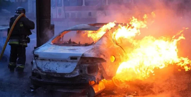 На відео Івана Федорова можна побачити наслідки ворожого удару по місту. Зокрема, горить легковий автомобіль, поряд знаходиться нерухомий трамвай з розбитими вікнами.
