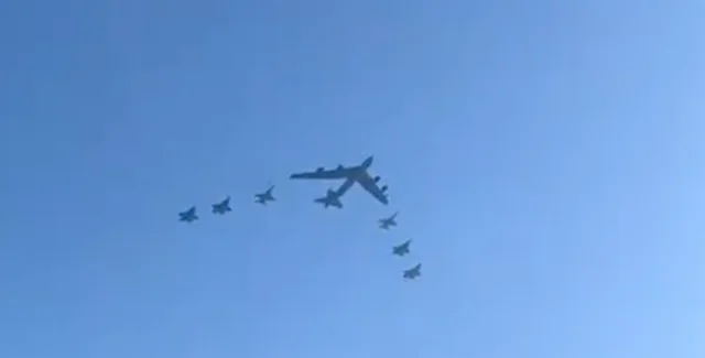 Американський стратегічний бомбардувальник B-52H Stratofortress у супроводі кількох F-35 пролетів над Естонією 24 лютого 2025. Про це повідомляє OSINT-акаунт у Х.