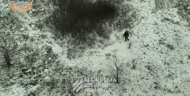 На відео видно, як окупанту скинули записку з написом, куди йти, він добрався до потрібної точки засніженими полями, де його забрали українські захисники.