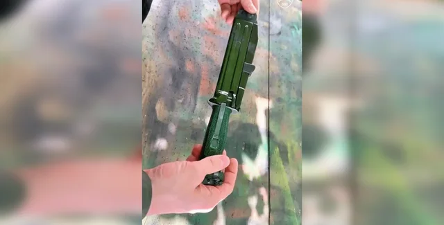 Військовий на відео показав, що зброя має кусачки, колюче-ріжучу кромку та водночас систему для одноразового пострілу з запобіжником.