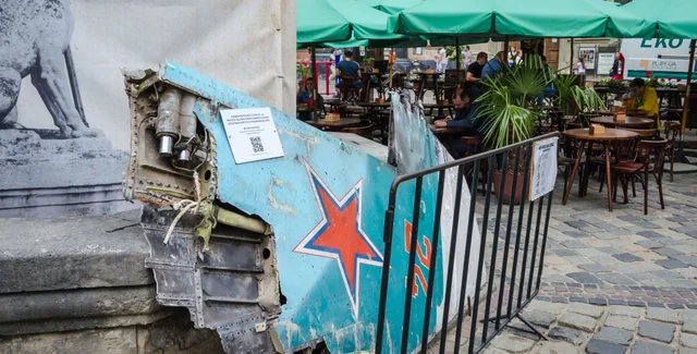 Крило збитого російського літака на площі у Львові | Фото: Getty Images