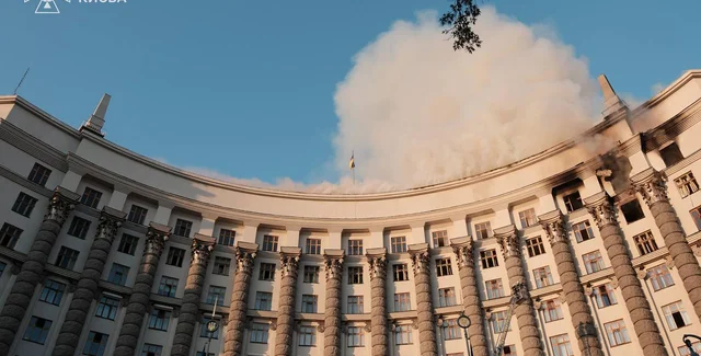 У Печерському районі виникла пожежа в будівлі Уряду. Також є повідомлення про локальні наслідки атаки в Голосіївському районі: вибиті вікна, окремі уламки на відкритій місцевості.