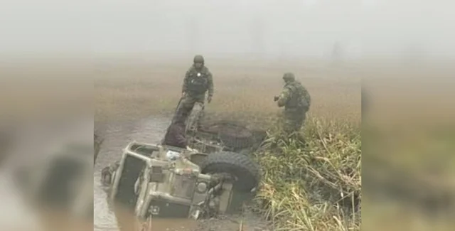 Техніка ЗС РФ тоне після підриву дамби у Бєлгородській області | Фото: Пепел