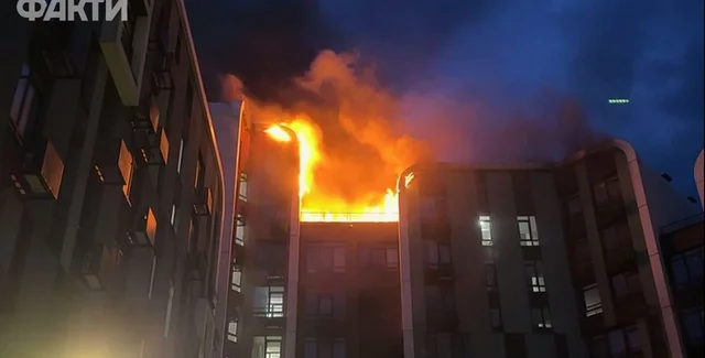 В Київській обласній військовій адміністрації підтвердили, що російські окупанти влучили по багатоповерхівці, внаслідок чого там здійнялась пожежа.