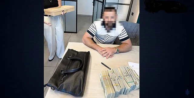 На кадрах можна бачити, як підозрюваний підписує папери про купівлю будинку, а перед ним у сумці на столі — пачки доларів.