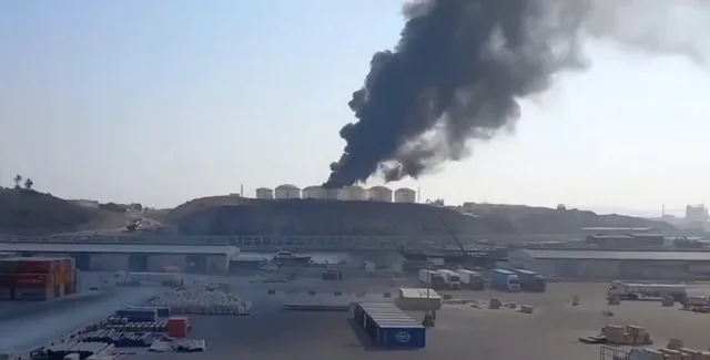 Після удару безпілотника по порту Салала почалася пожежа. На відео видно, як палають кілька резервуарів і здіймаються клуби чорного диму.