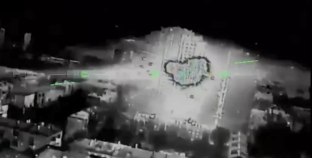 На відео з кадрами ураження бачимо, що у приміщення на середніх поверхах висотки влітають мінімум два мідлстрайки FP-2, кожен з яких ніс по 60-100 кг вибухівки. Перші секунди показують політ через місто, при цьому не помітно роботи засобів ППО: відео транслюється у високій якості, не видно і не чути пострілів. Далі дрони врізаються у вказану ціль та вибухають.