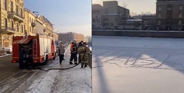 Як повідомила російському виданню "Бумага" мешканка Петербурга Поліна Каргіна, у вівторок, 9-го лютого на місце прибула бригада рятувальників на пожежній машині і почали "змивати" напис за допомогою гідранта.