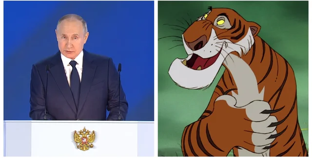 Під час щорічного звернення до Ради Федерації, яке відбулося 21 квітня, президент РФ Володимир Путін, розмірковуючи про сучасну міжнародну політику, заявив, що "Росію то тут, то там чіпляють без всяких причин", після чого провів паралель з антагоністом книги про Мауглі письменника Джозефа Редьярда Кіплінга.