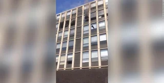 На відео видно, як чорний кіт, який вистрибнув з будівлі, приземлився і пішов, як ні в чому не бувало, далі.