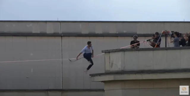 Еквілібрист повторив свій світовий рекорд ходіння по стропі в умовах міста.