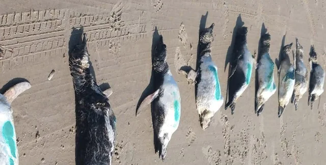 На несамовитих кадрах сотні мертвих пінгвінів лежать у ряд на пляжі. Загинути вони могли від ударів сильних хвиль під час сезонної міграції з Аргентини, Чилі та Фолклендських островів.