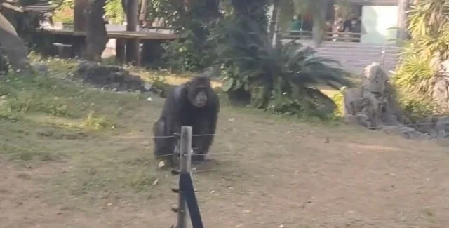 Самця шимпанзе явно обтяжувала увага публіки, він стрибав у межах відведеної йому території зоопарку, а потім схопив пляшку з водою та запустив у відвідувачів.