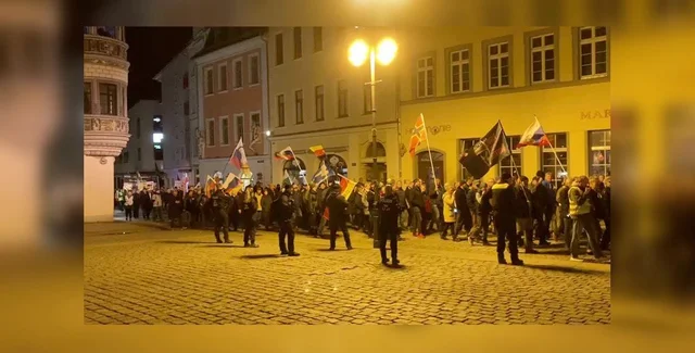 На кадрах видно, як велика група людей з прапорами Німеччини та Росії пересувається вечірніми вулицями міста. Мітингувальників супроводжують поліцейські машини.