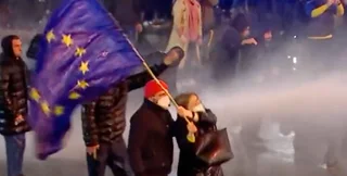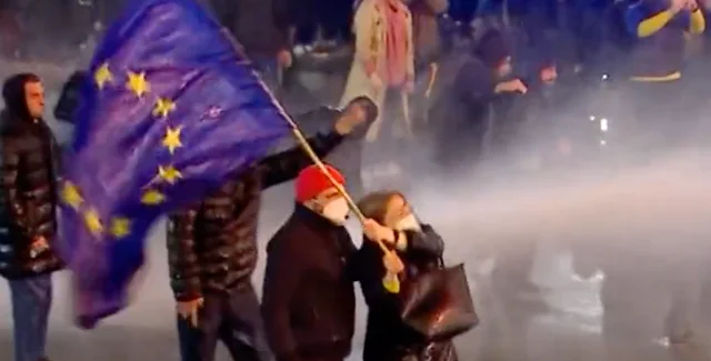В інтернеті широко розійшлося відео із протесту проти закону про іноагентів у Грузії з жінкою, яка розмахує прапором Євросоюзу під натиском води з водомета. 7 березня його опублікувало у Twitter видання Formula News.